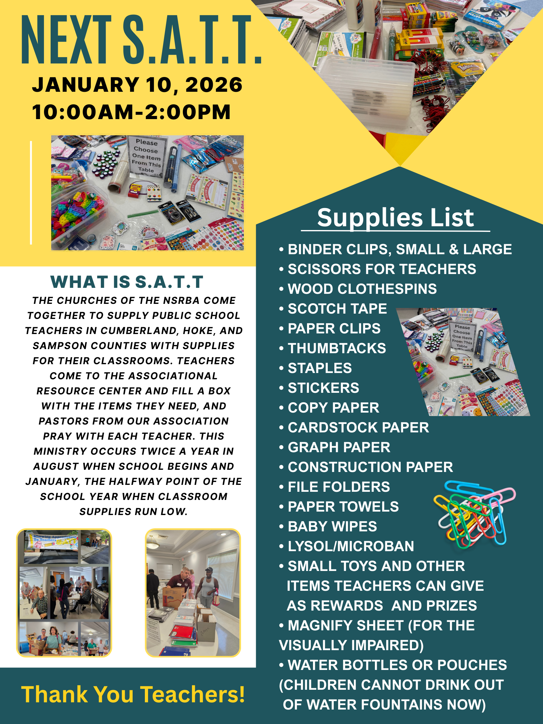 The churches of the NSRBA come together to supply public school teachers in Cumberland, Hoke, and Sampson counties with supplies for their classrooms. Teachers come to the associational resource center and fill a box with the items they need, and pastors from our association pray with each teacher.